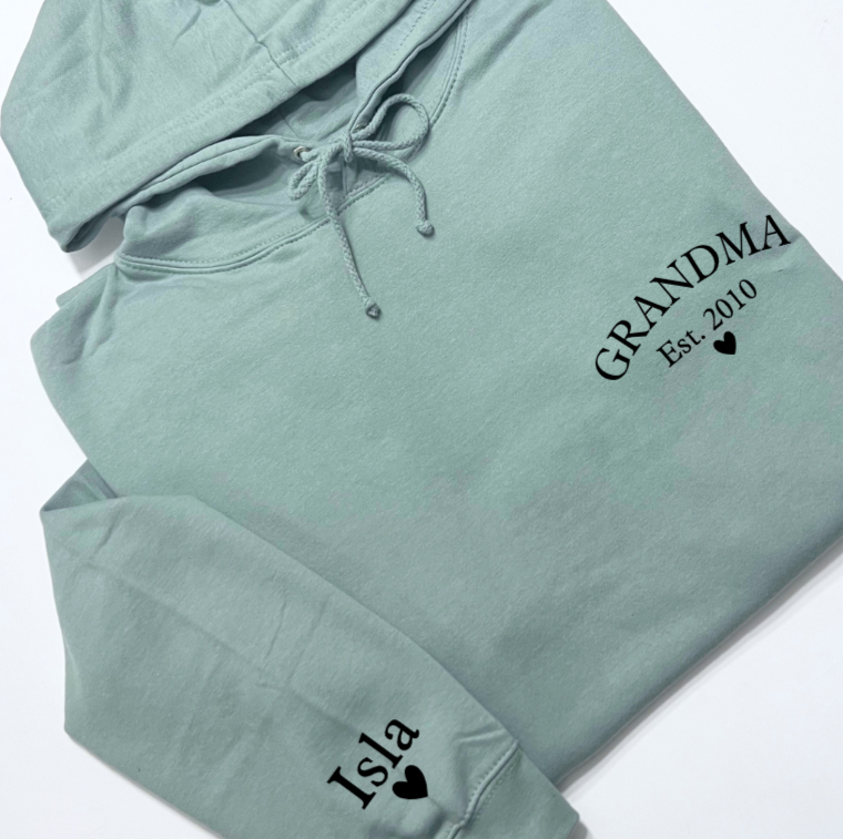 Indulge in the essence of grandparenthood with our "Grandma Est" Hoodie—a symbol of love and strength. Personalise it with your grandchildrens name on the sleeve, choose from a palette of colors, and experience bespoke comfort every day. This Hoodie is the perfect gift, embodying the pride and joy of being a Grandma. Tailored for grandmas who embrace their roles, it's not just a garment but a daily celebration of the beautiful journey of grandparenthood.