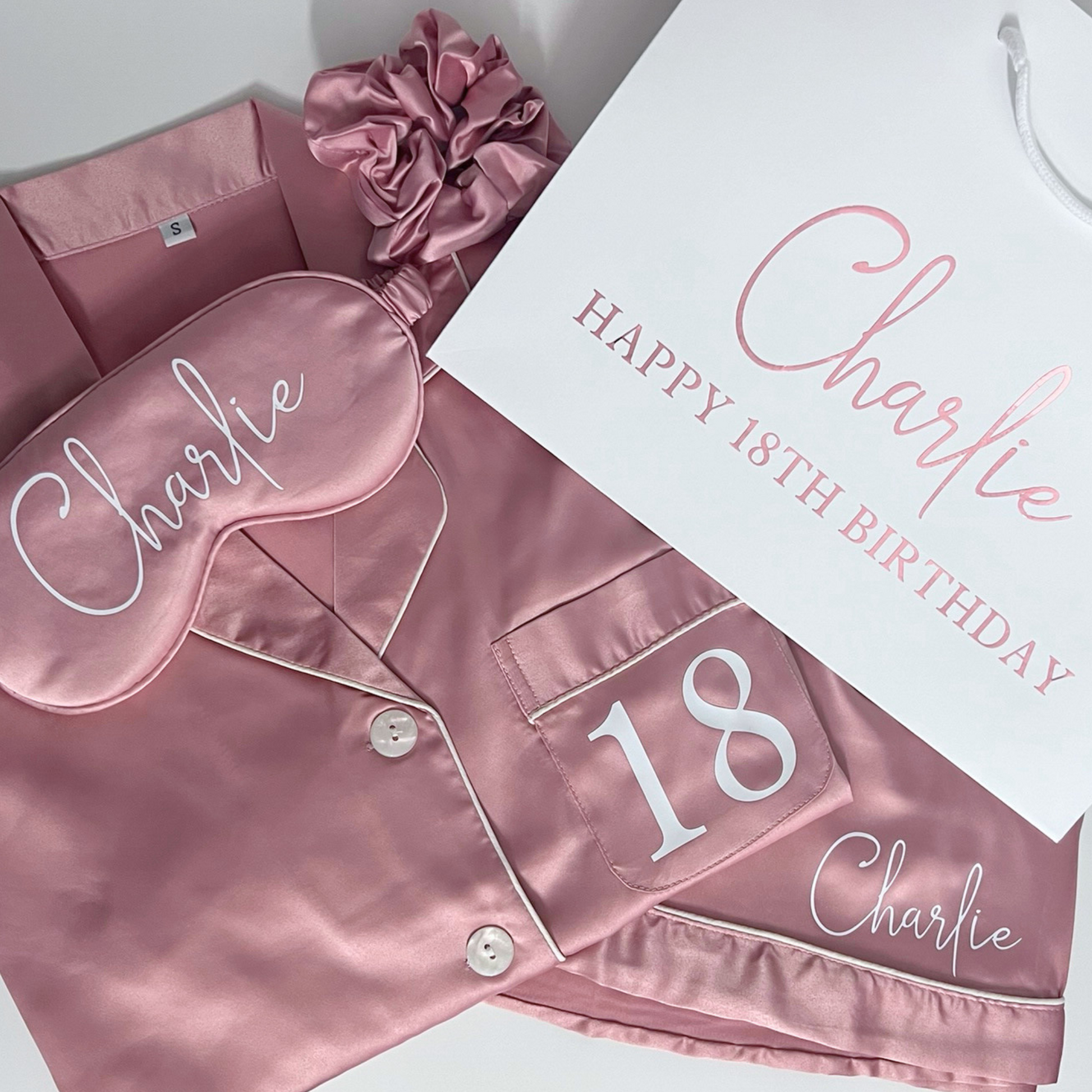 Transform your milestone birthday into a luxurious experience with my Personalised Luxury Satin Milestone Pyjama Gift Set complete with Satin Pyjamas, Eye Mask, Scrunchie and Gift Bag