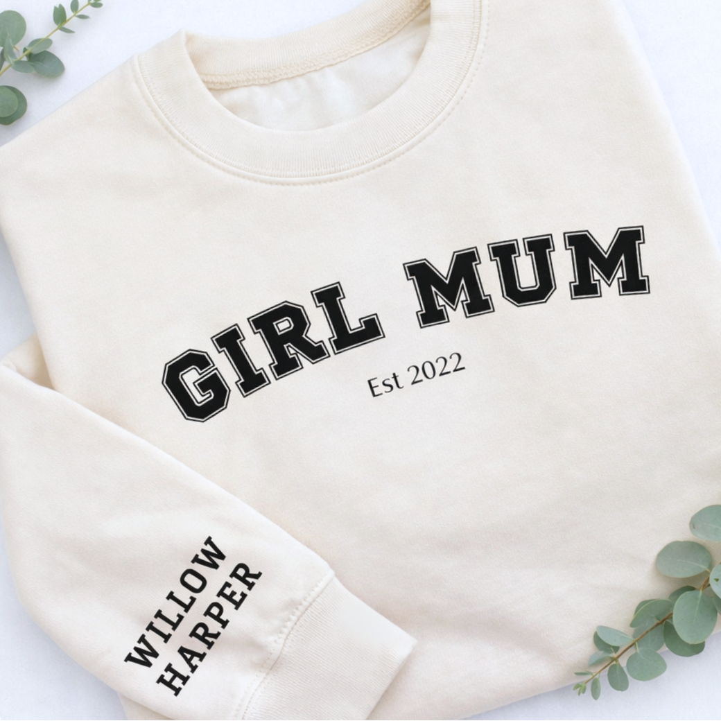 Featuring “Girl Mum” on the front and the year you became a mum, and with names added to the sleeve, this design makes a meaningful keepsake for yourself or a thoughtful gift.
